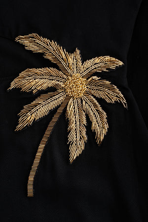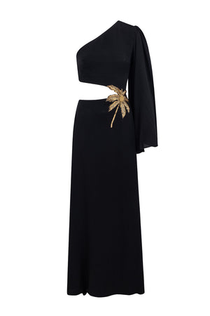 Presentamos nuestro impresionante y exclusivo vestido largo negro con cortes. Esta pieza de primera calidad cuenta con un intrincado bordado de palmeras, adornado con brillantes cuentas doradas y cortes estratégicamente ubicados para darle un toque sensual. Realza tu estilo con este lujoso y sofisticado vestido.