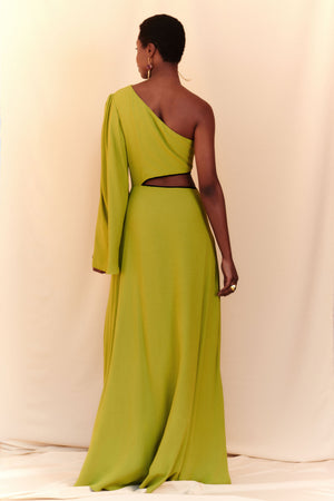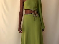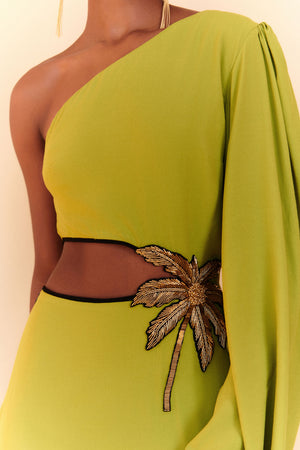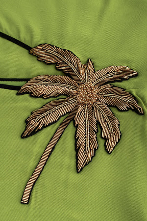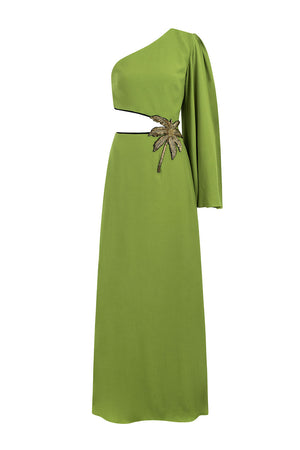 Presentamos nuestro impresionante y exclusivo vestido largo con cortes en color verde. Esta pieza de primera calidad cuenta con un intrincado bordado de palmeras, adornado con brillantes cuentas doradas y cortes estratégicamente ubicados para darle un toque sensual. Realza tu estilo con este lujoso y sofisticado vestido.