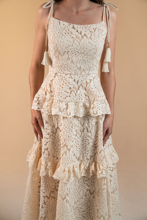 Presentamos la Falda Midi de Encaje con Volantes en Beige Vainilla, una pieza de Edición Limitada que derrocha elegancia y sofisticación. Esta falda presenta un corte de cintura alta, largo midi y un delicado encaje tropical. Con su diseño clásico y atemporal, es una prenda imprescindible en cualquier armario chic.