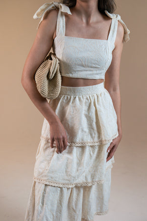 Eleve seu estilo com nosso Crop Top Bordado com Alça de Amarração em Baunilha. O delicado bordado floral e as alças femininas adicionam um toque de romance a este design campeão de vendas. Perfeito para um visual casual, mas estiloso.