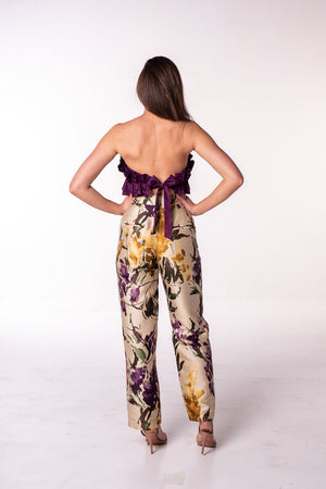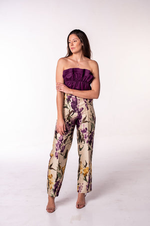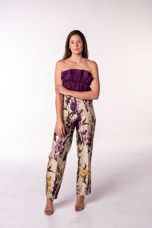 O top florido na cor roxa tem um design único, feito para elevar a beleza e a confiança das mulheres. Combine com as calças retas com padrão para um visual deslumbrante.