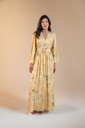 Vestido longo estampado tropical Marcela - amarelo manteiga