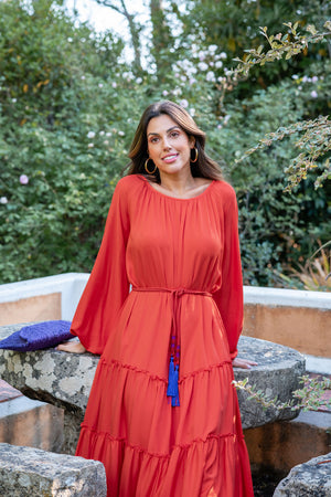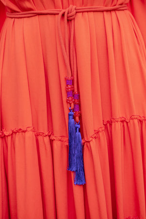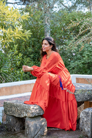 Este vestido é confeccionado em viscose macia e encorpada que exigiu 7 metros de tecido. É feito em atelier, com costuras francesas e possui um cinto bordado à mão, tornando-se uma peça de luxo. Com uma silhueta romântica e feminina, com certeza manterá você confortável e elegante ao mesmo tempo.