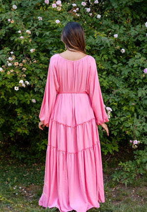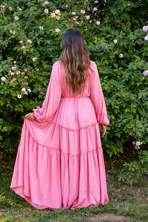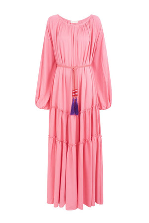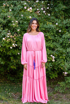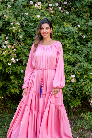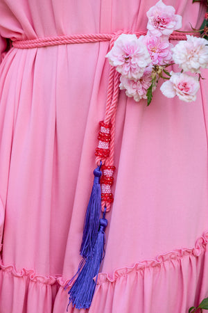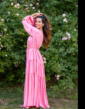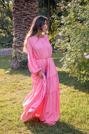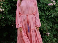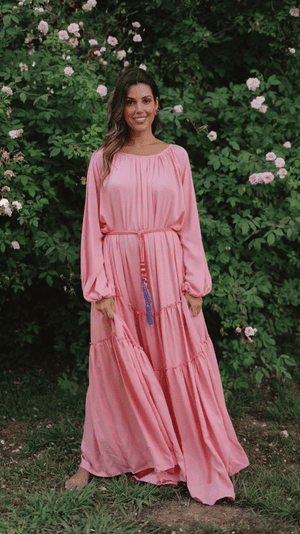 Este vestido é confeccionado em viscose macia e encorpada que exigiu 7 metros de tecido. É feito em atelier, com costuras francesas e possui um cinto bordado à mão, tornando-se uma peça de luxo. Com uma silhueta romântica e feminina, com certeza manterá você confortável e elegante ao mesmo tempo.