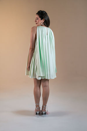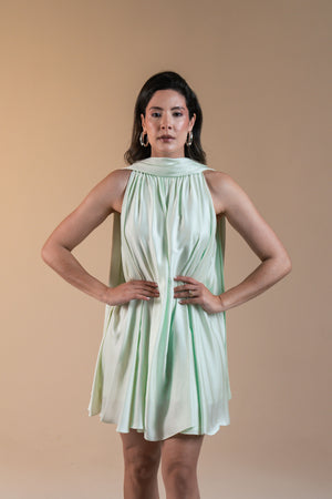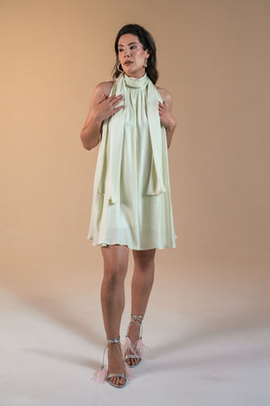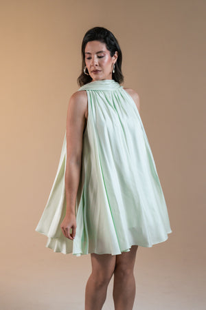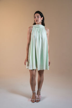 Confeccionado com maestria em cetim de viscose leve, este deslumbrante vestido curto de cetim em tom verde-água é a adição versátil perfeita para o seu guarda-roupa. Com um design fluido e uma gola versátil estilo lenço, ele pode ser usado com diversas amarrações para um look único em qualquer ocasião. Disponível em dois comprimentos - curto e alto - em um lindo tom de verde-água que vai realçar qualquer look.