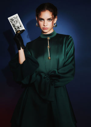 Entregue-se ao luxo do VESTIDO DO MÁGICO. Este vestido verde esmeralda de cetim é inspirado nos arcanos maiores do mágico, evocando mistério e elegância. Delicados botões de sol adornam a frente, dando a você todas as ferramentas para criar sua própria magia. Prepare-se para deslumbrar com esta peça exclusiva.