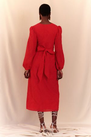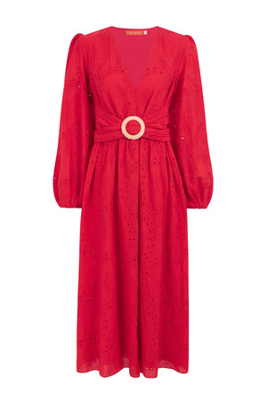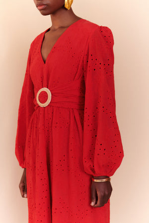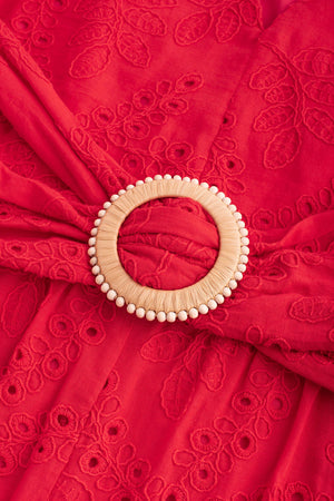Entregue-se ao luxo com nosso VESTIDO MARCELA BRODERIE ANGLAISE em vermelho deslumbrante. Feito de algodão bordado de forma intrincada, ele apresenta um cinto versátil para várias opções de amarração e uma fivela refinada em ráfia. Totalmente forrado e finalizado com detalhes de alta costura requintados, este vestido exala sofisticação a cada passo.