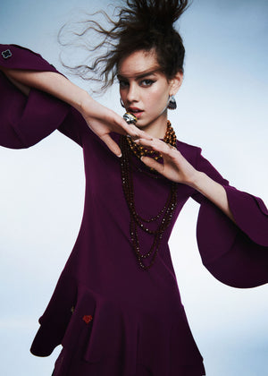 Apresentando THE FOOL DRESS em roxo profundo. Uma silhueta divertida inspirada nos arcanos maiores do tolo, simbolizando novos começos e bravura. Adornado com amuletos da sorte inspirados em temas de tarô, para um toque de exclusividade. Divirta-se em seu guarda-roupa com esta peça exclusiva.